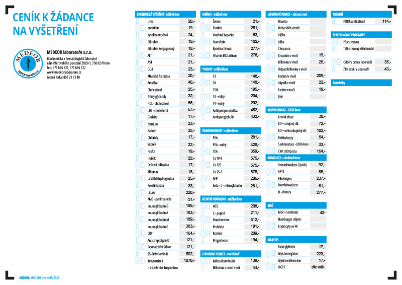 Ceník vyšetření laboratoří MEDEOR laboratoře s.r.o. ve formátu PDF: